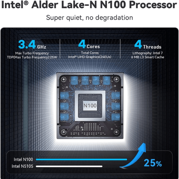 | Processor | Intel Processor N100 (with turbo boost to 3.40GHz) |